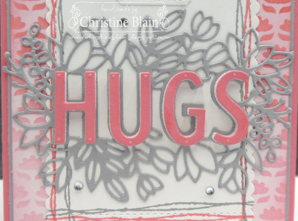The main panel is a Basic White scalloped rectangle, cut from a Stitched So Sweetly Die. In Basic Gray and Flirty Flamingo inks, I added some wonky "stitched" lines, from the Stitchery stamp set, deliberately overlapping them in an irregular way. I die-cut the leafy piece from Smoky Slate ink, and added Flirty Flamingo letters raised up on Foam Adhesive Sheet.