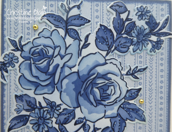 The card I'm sharing was actually my first one made, and my first time using masks. I think it could be improved upon (I was a bit heavy-handed with the layers of colour on the roses), but it's a starting point! I used only the masks and dies for the gorgeous floral piece, which gives quite a different look to when the outline is also stamped.